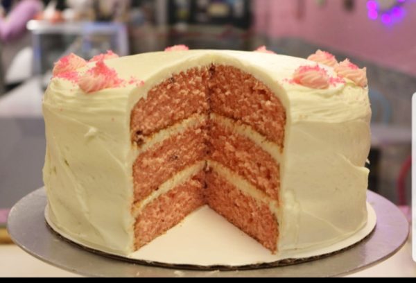 Strawberry layer cake with strawberry pieces in the batter. Iced with a white chocolate buttercream.